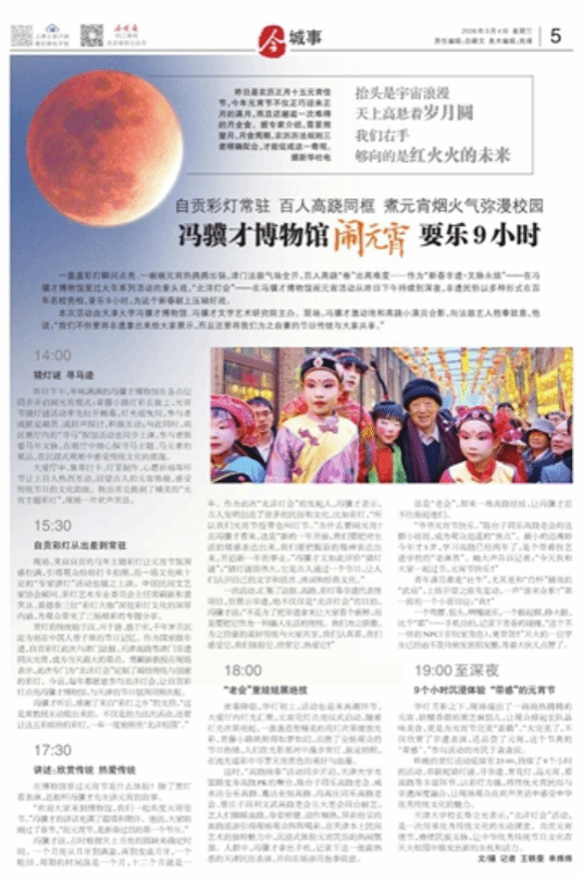 一盏盏彩灯瞬间点亮、一碗碗元宵热腾腾出锅,津门法鼓气场全开,百人高跷“卷”出高难度……作为“新春非遗·文脉永续”——在冯骥才博物馆里过大年系列活动的重头戏,“北洋灯会”——在冯骥才博物馆闹元宵活动从昨日下午持续到深夜,非遗民俗以多种形式在百年名校亮相,耍乐9小时,为这个新春献上压轴好戏。