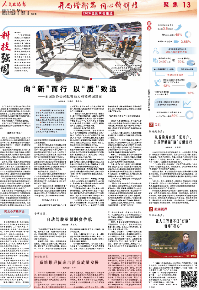 全国政协委员、天津大学教授杨全红认为,要从多个维度系统推进固态电池的高质量发展。强化基础研究的统筹协调,尽快厘清固态电池的能量密度边界与安全属性边界,系统梳理各类体系的优势与局限,明确不同发展阶段的应用场景,在此基础上科学理性绘制技术与产业发展路线图。