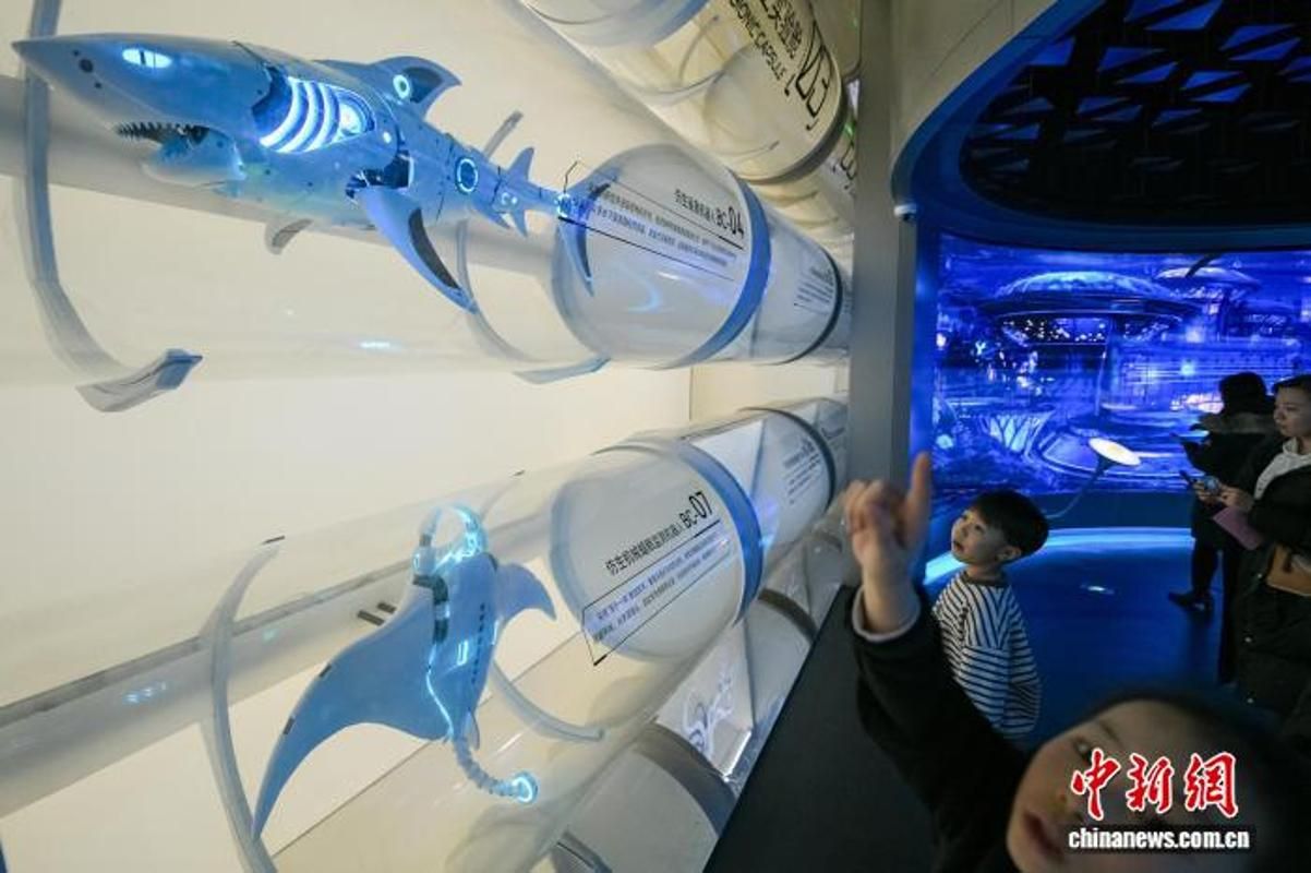 1月30日,游客在位于天津滨海新区的国家海洋博物馆“未来海洋”展厅参观各种海洋仿生机器人。