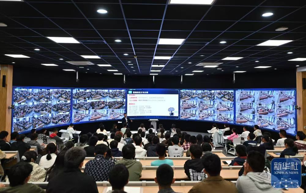 当日,天津大学《人工智能导论》正式开课。这是天津大学面向全体本科生推出的通识课程,约4000名学生在30余间智慧教室内同步听讲。