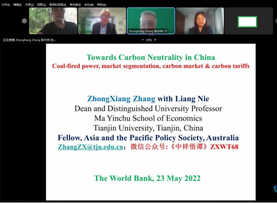 本站讯(马寅初经济学院供稿)2022年5月23日,应世界银行驻华代表处的邀请,天津大学马寅初经济学院创院院长、卓越教授,国家能源、环境和产业经济研究院院长张中祥应邀以“Towards Carbon Neutrality in China: Coal-fired Power, Market Segmentation, Carbon Market & Carbon Tariffs”为题做了一个半小时的专场报告。世界银行中蒙韩局局长、即将赴任副行长的Martin Raiser主持了报告会和讨论,27位世界银行的员工参加了报告会。