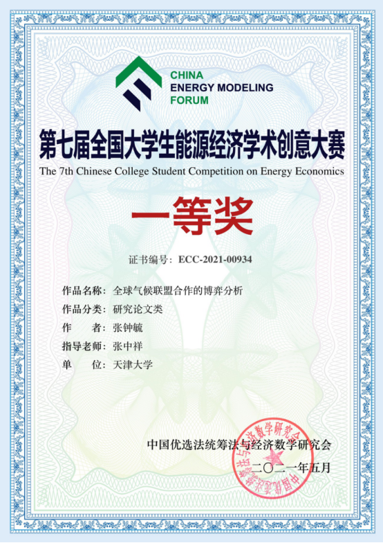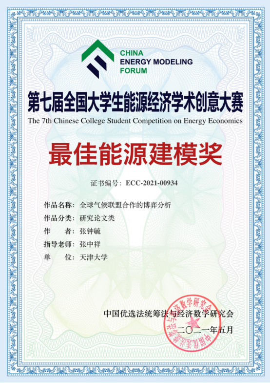 本站讯(马寅初经济学院供稿)近日,由中国优选法统筹法和经济数学研究会主办、中国“双法”研究会低碳发展管理专业委员会和太原理工大学承办的第七届全国大学生能源经济学术创意大赛总决赛在线上举行。经过初赛和决赛,天津大学博士生张钟毓的论文“全球气候联盟合作的博弈分析”荣获第七届全国大学生能源经济学术创意大赛(研究生组)一等奖,该篇论文同时荣获本次大赛“最佳能源建模奖”。天津大学马寅初经济学院创院院长张中祥荣获优秀指导老师。张中祥教授指导的博士生崔亚蕾的论文 Unequal age-based household carbon footprints in China 荣获第七届全国大学生能源经济学术创意大赛(研究生组)三等奖。