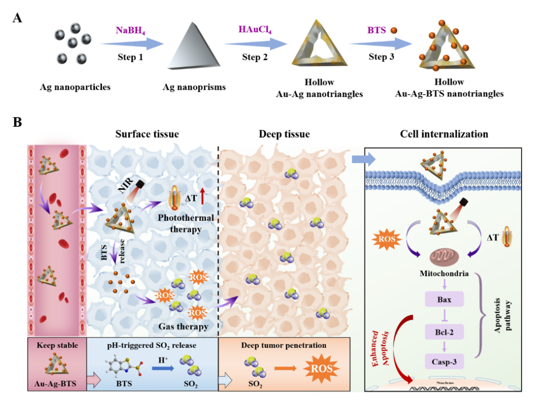 李楠课题组研发的新一代纳米抗癌机器人将金-银中空纳米三角和二氧化硫前药精巧地整合于一体,构建了一种有效的光热-气体联合肿瘤深部治疗纳米系统。该纳米抗癌机器人从三个方面进行了创新,有效提高了治疗的深度与精准度。首先,改变形状,设计出三角型纳米机器人提高穿透力。三角型载体比普通球形载体更能容易进入细胞,实验中从分析荧光强度来看大概是普通球形的1.3倍。第二,让纳米抗癌机器人本身成为治疗癌症良药,课题组遴选了在纳米级十分活跃的金银作为纳米机器人制备材料,在近红外光照射下,金-银中空纳米三角可以产生大量的热,杀死肿瘤细胞,实现光热治疗。第三利用癌症细胞微环境的特性,智能解锁纳米机器人搭载的抗癌药物,更好地杀死癌症细胞,不伤害正常细胞。该团队利用肿瘤细胞内的酸性条件诱导二氧化硫前药按需释放二氧化硫气体,该气体可在肿瘤细胞内部弥散,实现对深部肿瘤的治疗。