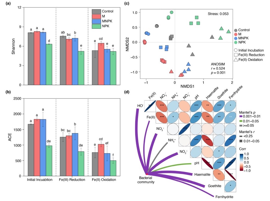 天津大学地科院余光辉教授利用长期定位施肥土壤富集微生物群落,探究了微生物群落-铁矿物协同驱动土壤泥浆中羟基自由基形成的途径和机制。研究发现,微生物和铁矿物协同驱动了土壤泥浆中羟基自由基的形成;培养21天后,培养体系中羟基自由基浓度可达100nM。借助化学分析、同步辐射、高通量测序、随机森林和结构方程模型等分析手段和统计方法,研究发现微生物可通过调控超氧离子直接影响羟基自由基形成,也可通过驱动铁矿物转化而间接调控羟基自由基产生。其中,微生物驱动的铁矿物氧化还原转化是土壤泥浆中羟基自由基形成的主控因子;Geobacter,Paucimonas,Rhodocyclaceae_K82和Desulfotomaculum是土壤中控制羟基自由基产生的关键微生物属。该发现对全面认识表层地球系统中活性氧的形成途径具有重要意义,也可为深入理解氧化还原波动环境中碳周转和养分循环提供新认识。