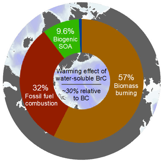 北极地区正以全球其他地区两倍的速度快速变暖,引起了全世界的高度关注。北极的冰川融化、海冰减少,和随之引发的全球大气环流异常,地区生物多样性减少,以及一系列生态和经济问题都源于北极气候的快速变暖。众所周知,二氧化碳气体和黑碳气溶胶是大气中最重要的增暖剂。然而,近年来,科学家们逐渐关注到另一类辐射吸收性有机气溶胶——棕碳对气候变暖有不可忽视的贡献。那么棕碳气溶胶的增暖效应对北极的气候变化有多大贡献?北极的棕碳来源又是什么? |