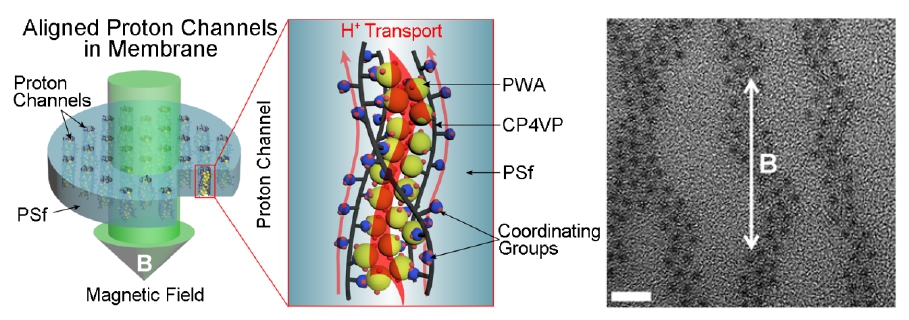 左图:通过磁场构建沿质子交换膜透过面方向排列的高效质子传输通道,磷钨酸系于配位聚合物分子链上。右图:沿膜透过面方向排列的质子通道的透射电子显微镜影像(标尺长度5纳米)。