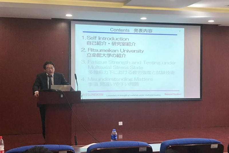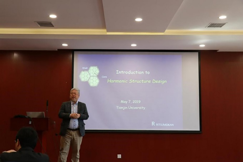 随后,日本立命馆大学理工学部的Takamoto Itoh教授介绍了立命馆大学的历史以及理工学部的研究方向、实验设备和研究领域。Kei Ameyama教授对调和组织结构材料的变形机制进行了详细的介绍。Akira Ueno教授对结构材料在复杂环境下的疲劳裂纹扩展行为作了详细的介绍与分析。日本立命馆大学理工学部13位研究生以及天津大学化工学院的6位研究生分别对自己的研究方向、研究进展和成果作了汇报。