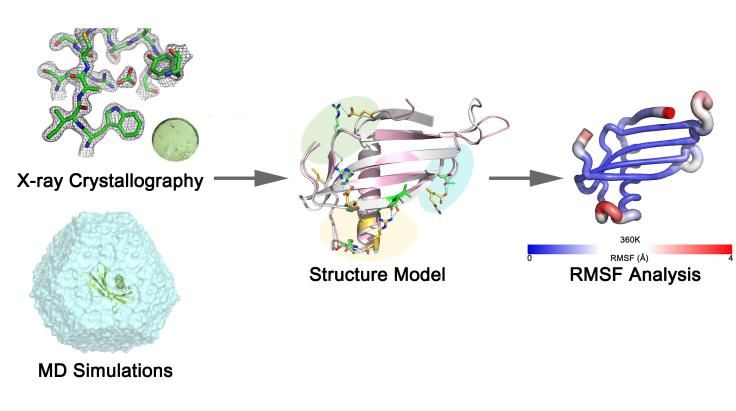 进一步通过分子动力学模拟结合结构分析的手段发现突变体结构中一些柔性环区域的稳定性显著增强(如loop K25-R31和loop I38-M42),这些柔性还区域增强的协同效应使得整体结构稳定性的增强。