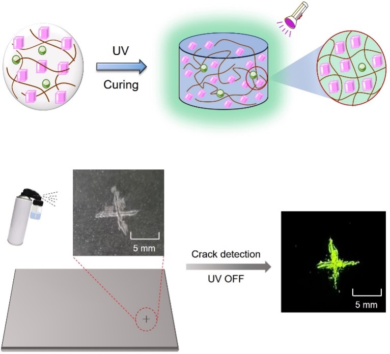 无定形有机长余辉发光材料可以实现简单的溶液加工和大面积均匀发光,但这类材料的发光性能受材料本征刚性环境的影响较大。为此,我们提出了一种紫外光固化增强(UV-curing-enhanced)有机主客体掺杂体系长余辉性能的普适策略,即通过光固化构建的刚性环境促进主客体之间的相互作用,从而诱导出高性能长余辉发射。利用这种可溶液加工、可大面积涂覆和“易于实现”的材料制备策略,有望促进无定形有机长余辉材料在信息标记与保护、表面无损探伤等领域的深度应用。同时,在表面无损探伤领域,对比磁粉检测和渗透检测,这类具有自主知识产权的新型试剂类无损探伤方法的成像更加便捷迅速,且技术附加值更高,有望为有机长余辉材料打开一个重要的商业应用出口。