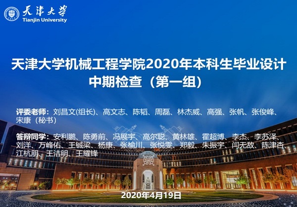 本站讯(通讯员 于凌云)为保证2020届本科生毕业设计(论文)按期保质完成,根据《天津大学本科生毕业设计(论文)管理规定》(津大校教〔2006〕39号)精神,4月17日至24日,机械工程学院各专业组织对2016级本科生毕业设计进行中期检查。在全面落实疫情防控的背景下,今年的毕业设计中期检查方式显得格外“特殊”,评审专家全程采用腾讯会议网络答辩形式对学生毕业设计(论文)进展情况及主要问题进行交流提问,针对学生的问题提供个性化指导。