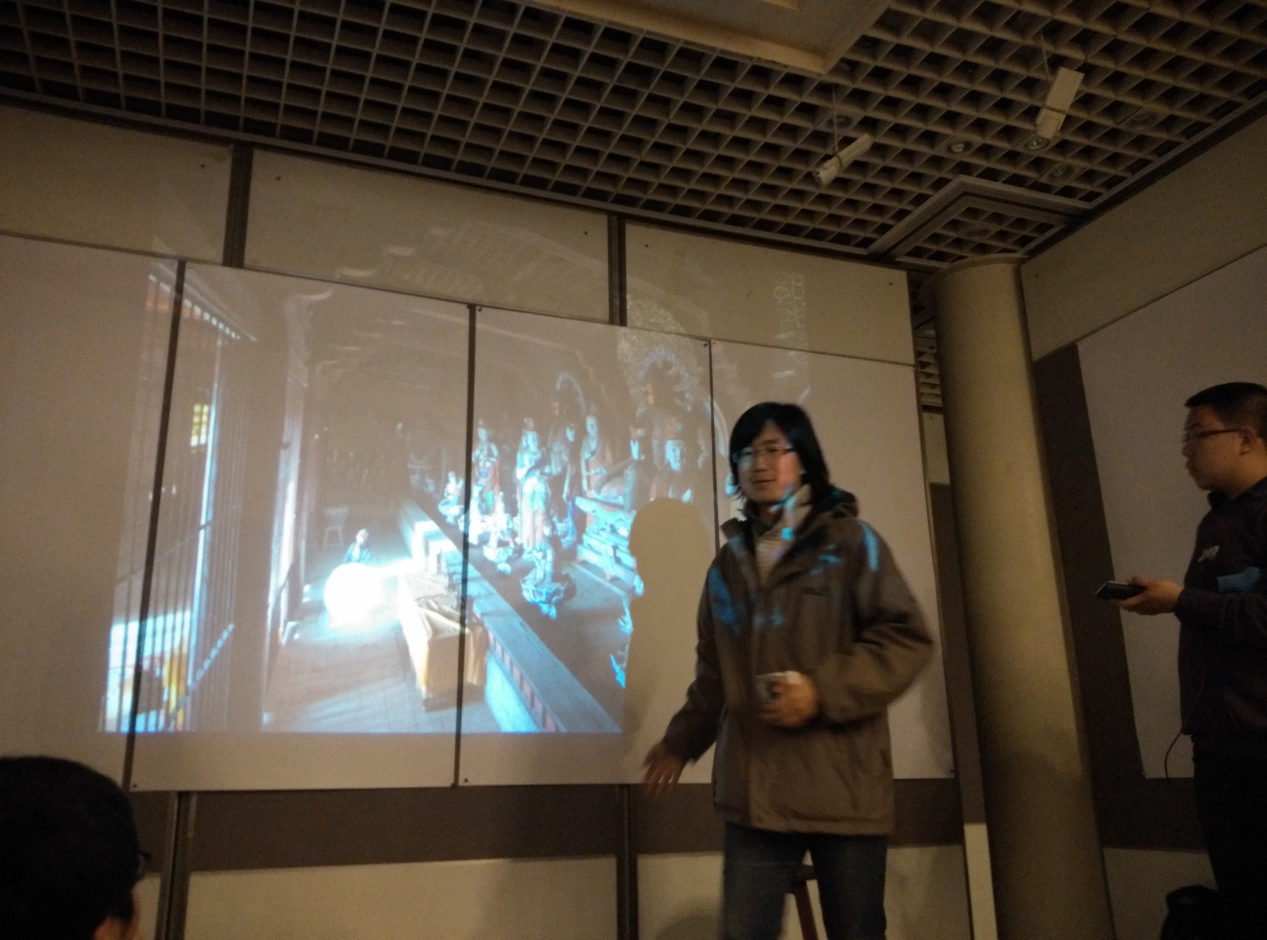 佛光寺又名佛光寺东大殿,坐东朝西,大殿中部散布大小佛像30余尊,大殿西侧和后部还有塑像近300尊。把这座古刹“搬”到课堂上,还得让学生身临其中,丁垚花了一番心思:“我们的建筑系馆和佛光寺的几何和空间关系非常相似:建筑系馆也为东西向方位,与佛光寺方位吻合;建筑系馆内一层通往二层的登楼楼梯则可以模拟佛光寺大殿外拾级而上的台阶。”于是,丁垚按照1:4的比例把佛光寺“微缩”到了建筑系馆。他在建筑系馆二层的三侧墙壁上布置18块高度相同的白色展板来模拟佛光寺墙壁;利用两台高度相同的立式投影仪将佛光寺殿内300余尊塑像图片按照真实方位平行放映在对应的展板上;通过控制馆内的4排灯光来调节明暗和光影。更妙的是,他还利用一台便携式投影仪进行移动放映,引导学生们在虚拟佛光寺中参观、走动,学生可以由“台阶”走进“殿内”,由“殿内”看到“殿顶”,实现了“全息投影”的效果。