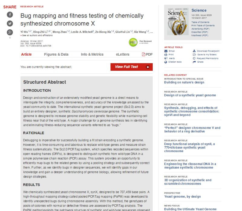 Sc2.0计划旨在重新设计并合成酿酒酵母的全部16条染色体(长约12Mb,Mb:百万碱基对)。2014年Sc2.0已创建了一个单一的人工酵母染色体,这次科学家们共完成了5条染色体的化学合成,其中中国科学家完成了4条,占完成数量的66.7%,把Sc2.0计划向前推进了一大步,意味着已经成功合成了酵母基因组的约三分之一。元英进带领的天津大学团队完成了5号、10号(synV、synX)染色体的化学合成,并开发了高效的染色体缺陷靶点定位技术和染色体点突变修复技术。戴俊彪研究员带领清华大学团队完成了当前已合成染色体中最长的12号染色体(synXII)的全合成。深圳华大基因研究院团队联合英国爱丁堡大学团队完成了2号染色体(synII)的合成及深度基因型-表型关联分析。