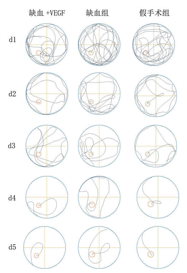 水迷宫是测试大鼠空间学习记忆能力的经典方法,它利用的是大鼠会游泳但又讨厌水的特性。水迷宫系统包括三部分,首先是测试区域,一个圆形水缸里面有一个低于水平面的平台,实验时将水染黑,大鼠看不到水下的平台;第二部分是数据采集系统、摄像头,能够追踪和记录大鼠的运动轨迹;第三部分是数据采集和处理软件。实验共分为两个阶段。第一阶段是定位航行实验,也就是学习阶段,进行五天,每天两次。我们将水缸人为地分为四个象限,让大鼠分别从四个象限开始游泳,然后记录其找到平台的时间,即逃避潜伏期。随着训练天数的增加,大鼠找到平台的时间越来越短,说明大鼠已经记住平台的位置。在第二阶段,也就是测试记忆的阶段,将平台撤走,观察大鼠游过目标象限的百分比。实验结果发现,缺血组大鼠的学习能力减弱,空间记忆功能降低;而缺血+VEGF组学习能力与空间记忆能力更接近假手术组,从而说明VEGF能改善这种空间记忆的损伤。