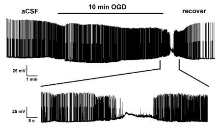 在离体实验中,她们使用的是经典的脑片膜片钳进行单细胞全细胞记录,观察神经元兴奋性以及突触传递情况的变化。通过对脑片进行糖氧剥夺的方式建立缺血模型。如图所示,先在正常脑脊液中进行膜电位的记录,然后进行10min的糖氧剥夺OGD,在此期间,细胞会出现一系列电变化,包括膜电位和动作电位的方法频率,这两者都体现了细胞兴奋性的变化。