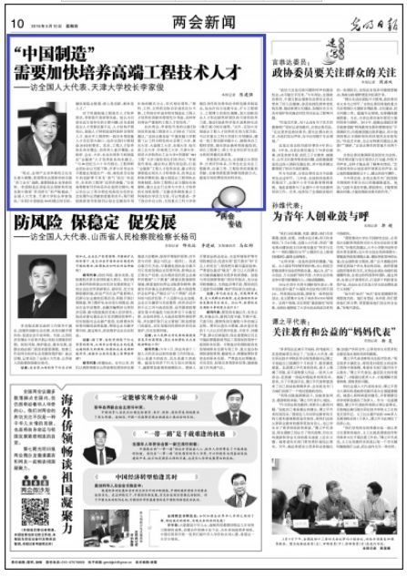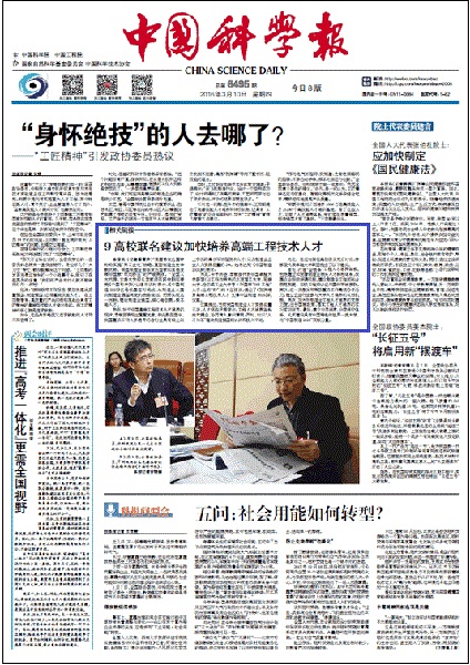 中国科技报3月10日头版刊发《9高校联名建议加快培养高端工程技术人才》主题文章 天津大学校长李家俊发声