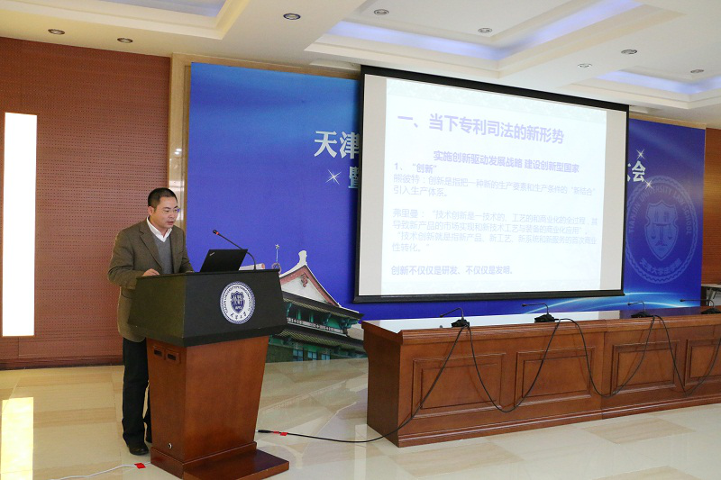 开幕式结束后召开了“双创”与知识产权制度改革理论研讨会。研讨会由天津大学知识产权法研究基地执行主任俞风雷主持。研讨会分为两个环节。第一环节,董涛作了题为“专利行政执法几个理论误区”的报告,报告指出了当前背景下加强专利保护的重要性,揭示了行政执法中存在的误区,即将私人权利性质与侵害私人权利行为的性质相混淆;对专利法所保护的私益和公益相混淆;将专利民事司法救济与创新者秩序的构建完全等同。