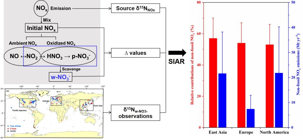 本站讯(地球系统科学学院供稿)工业革命以来,人类活动导致陆地大气系统的活性氮快速持续增加,现已成为最突出的全球性环境问题之一。其中,以燃煤和机动车尾气为主的化石源氮氧化物(NOx)排放被认为是大气硝态氮(NOy)污染和沉降通量增加的主要原因。但是,由于地表微生物氮循环和生物质燃烧等产生的非化石源NOx的排放强度及其对大气NOx的贡献难以约束,导致陆地大气化石和非化石源NOx的相对贡献尚不确定,总NOx排放量不清楚,这影响大气NOx减排策略的制定、沉降量清算和模拟,以及氮沉降生态效应的评估。