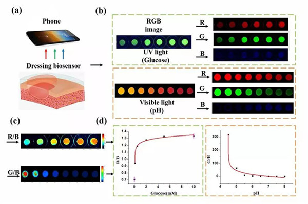 针对糖尿病伤口监测和愈合,该团队利用亲水抗生物粘附的两性离子水凝胶,结合葡萄糖酶级联反应,利用葡萄糖氧化酶(GOx)和辣根过氧化物酶(HRP),催化无色底物生成荧光产物。同时利用苯酚红作为酸碱指示剂,得到的水凝胶敷料能够同时将pH和葡萄糖信号转化为可见光信号,并且两种信号不会互相干扰。进一步可以利用手机采集图像信息,提取图像的RGB数据,通过设定的MATLAB软件程序和公式拟合,分析图像数据,输出图像中对应的伤口pH值和葡萄糖浓度,实现精准定量分析。