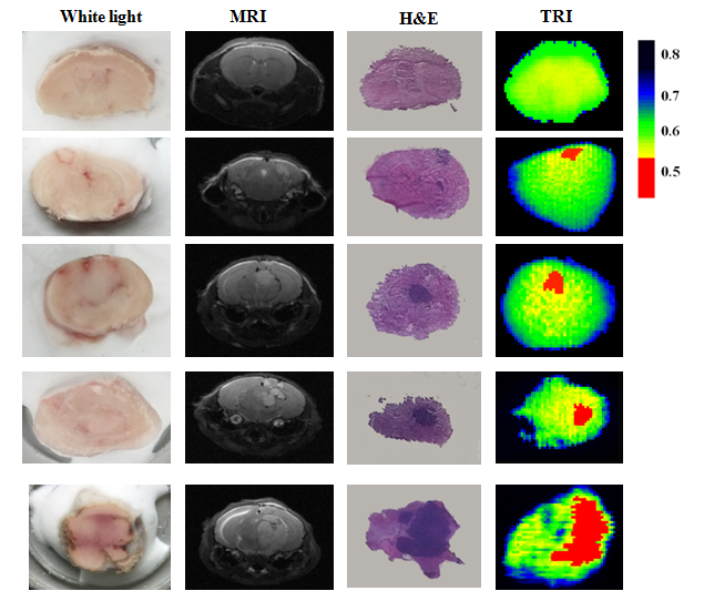 脑胶质瘤组织的可见光、磁共振成像、H&E染色与太赫兹反射扫描成像对照图