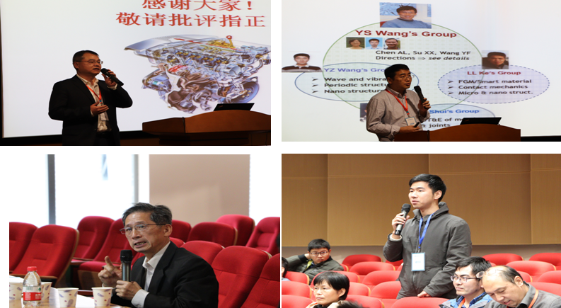 王毅泽做了题为《力学超材料中弹性波的调控》的报告。他首先介绍了多场耦合声子晶体与弹性波超材料的研究进展,主要包括压电声子晶体、压电/压磁与磁电弹性声子晶体、以及声子晶体中弹性波的局部化问题,之后介绍了近期研究成果。王毅泽还同与会专家就弹性波应用于柔性材料中的损伤探测等问题进行了跨学科交流。最后对广大博士们提出了殷切期望。