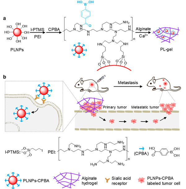 图:基于PL-gel的肿瘤转移示踪系统。(a) PL-gel的构建。(b) PL-gel用于持续的肿瘤特异性标记和肿瘤转移的无自发荧光示踪。
