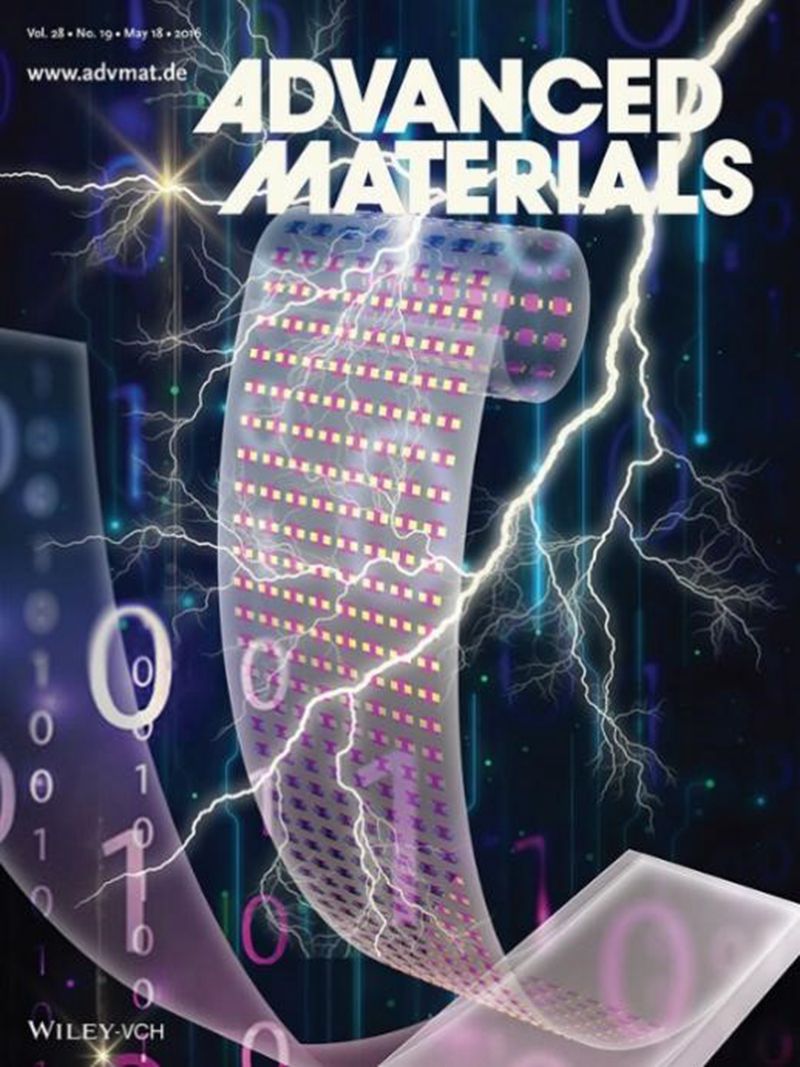 最近胡文平团队及合作者发展了具有原子级平整表面的二维云母单晶薄片的制备方法,克服了广泛使用的具有铁电性质的含氟聚合物表面粗糙的缺点,并成功应用于有机场效应晶体管(OFET)的驻电体绝缘层,获得了一种具有全新工作机理的柔性、多态、非易失存储器。此工作被《先进材料》选为封底文章发表(Adv. Mater. 2016, 28, 3755)。