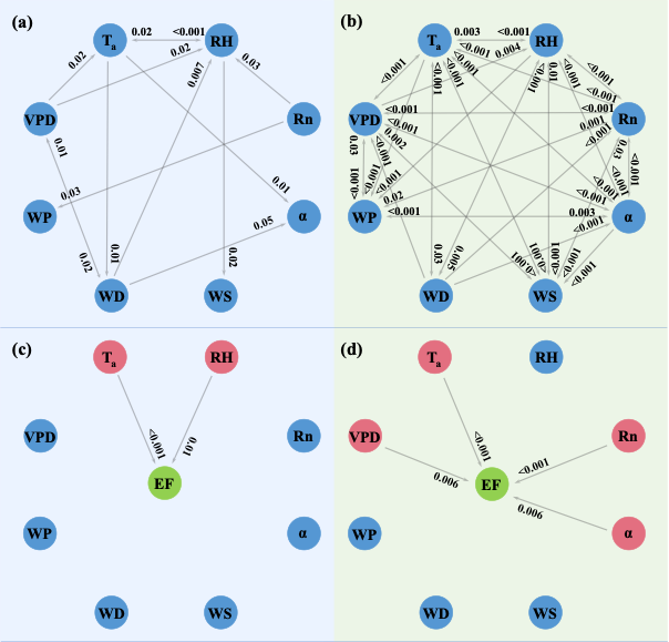 图1日尺度和半小时时间尺度上环境因子以及能量分配(蒸散比-EF)之间的指向性控制关系