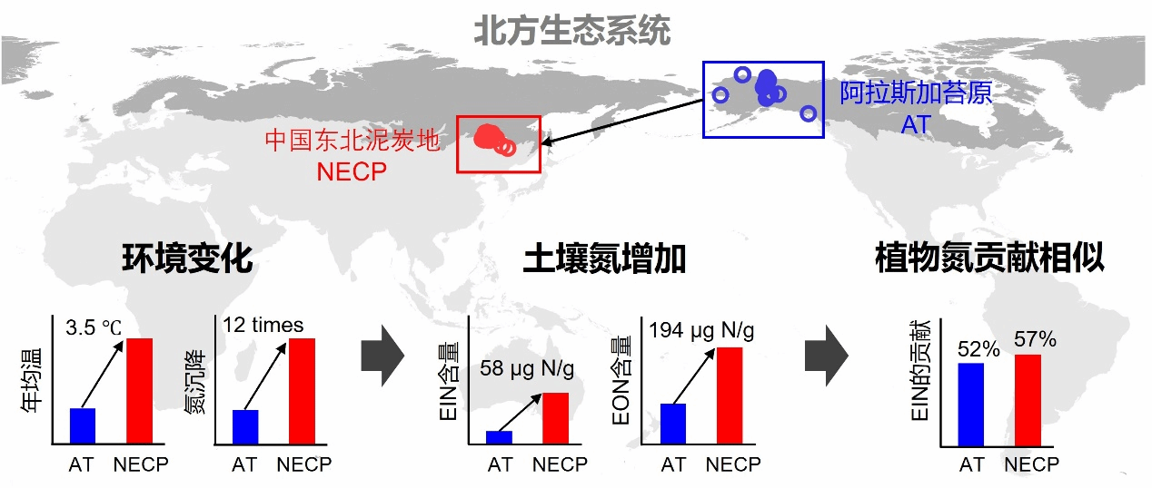 通过进一步对比中国东北泥炭地和阿拉斯加苔原同属植物的氮源贡献,他们还发现气候变暖(年均温增加3.5℃)和人为氮污染(氮沉降增加12倍)虽然导致土壤无机氮的增加量比有机氮低3倍多,但二者对植物总氮的贡献格局并未发生改变。