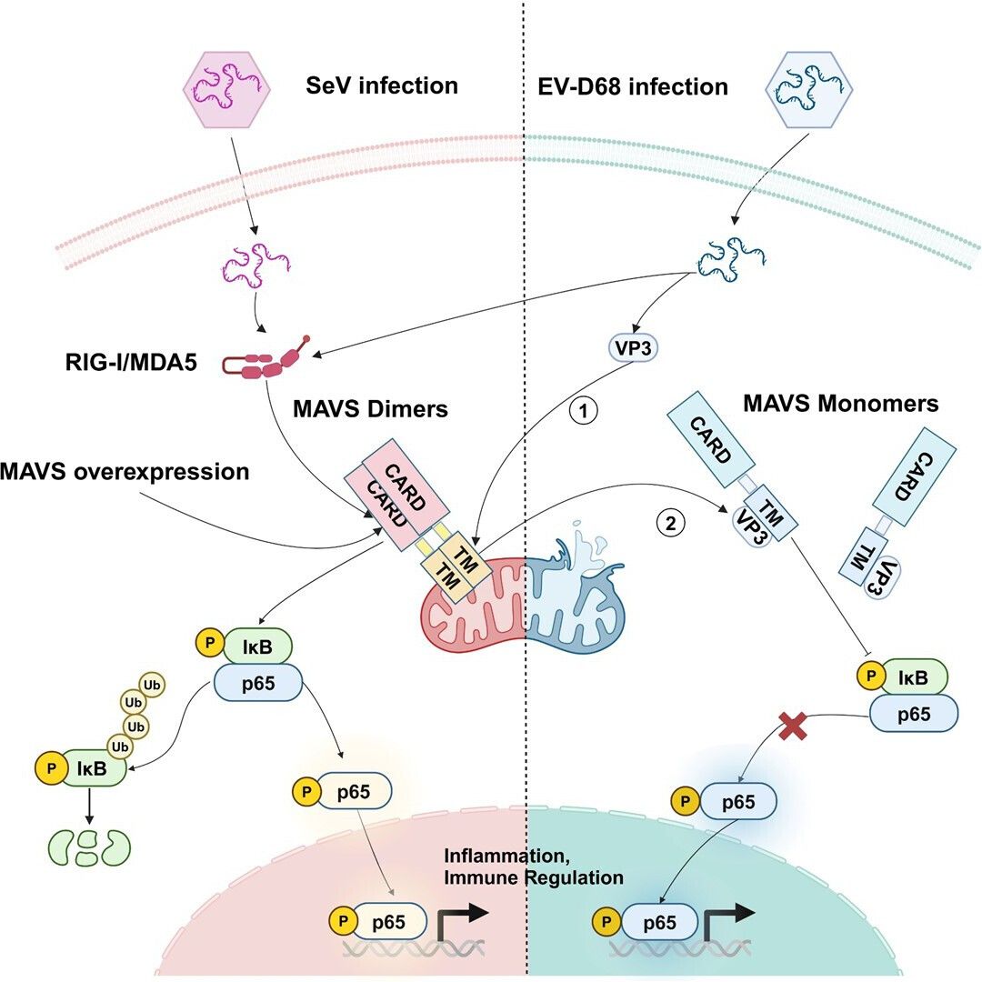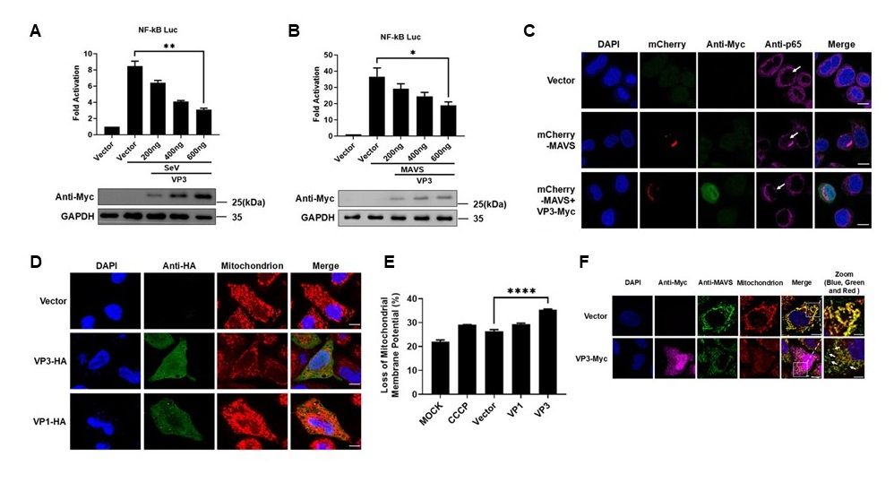 团队评估了EV-D68 VP3对NF-κB信号通路的调控作用,证实VP3可显著抑制NF-κB通路激活及下游炎症因子表达。同时通过观察线粒体形态与包含线粒体膜电位在内的线粒体生理指标发现EV-D68感染以及EV-D68 VP3的过表达均会导致线粒体损伤的发生,同时VP3还会诱导MAVS从线粒体上释放,并抑制MAVS的寡聚化,从而阻断MAVS介导的抗病毒信号级联反应。