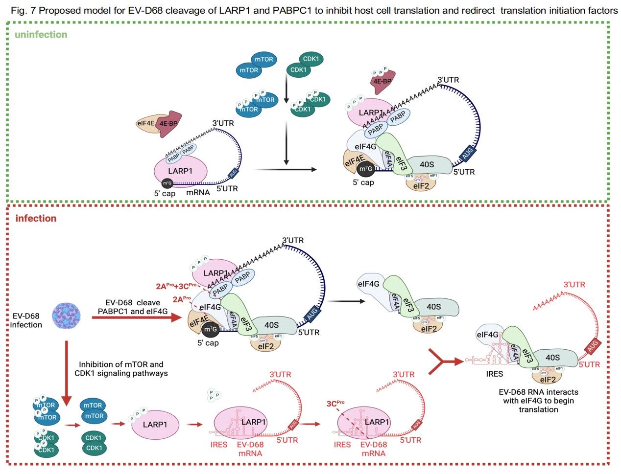 发表于《PLOS Pathogens》题为“EV-D68 cleaves LARP1 and PABPC1 by 3Cpro to redirect host mRNA translation machinery toward its genomic RNA”的论文中,王涛团队报导EV-D68感染显著抑制宿主整体蛋白翻译水平,LARP1和PABPC1分别被病毒蛋白酶3Cpro和2Apro切割,而EV-D68切割削弱其翻译调控功能,达到削弱宿主翻译的目的;病毒可利用IRES介导的不同于宿主的翻译机制,增强病毒自身的蛋白合成和病毒复制。