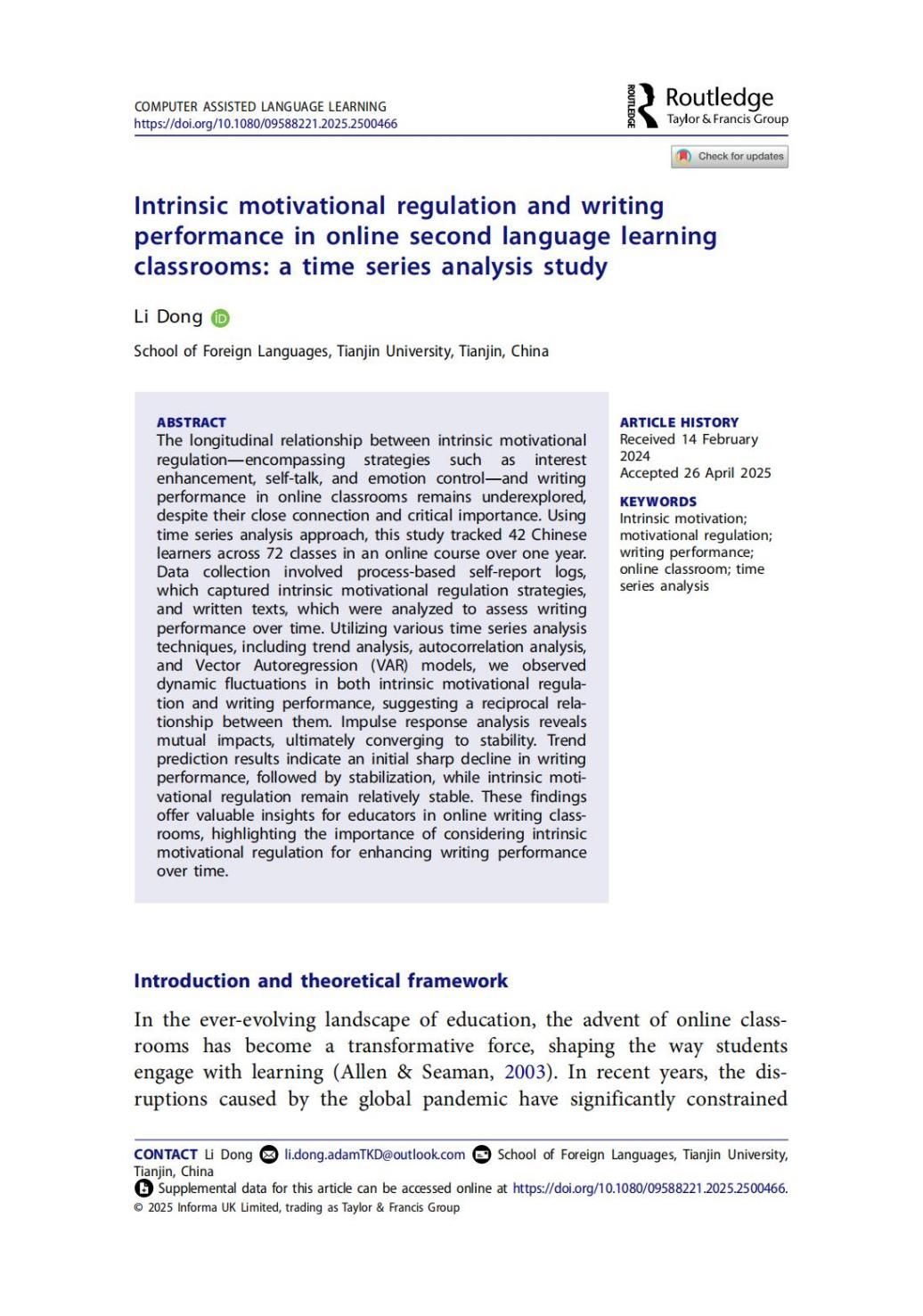 本站讯(通讯员 霍培)近日,外国语学院董礼副教授在语言学国际顶级期刊《Computer Assisted Language Learning》发表题为 “Intrinsic motivational regulation and writing performance in online second language learning classrooms: a time series analysis study” 的研究论文。