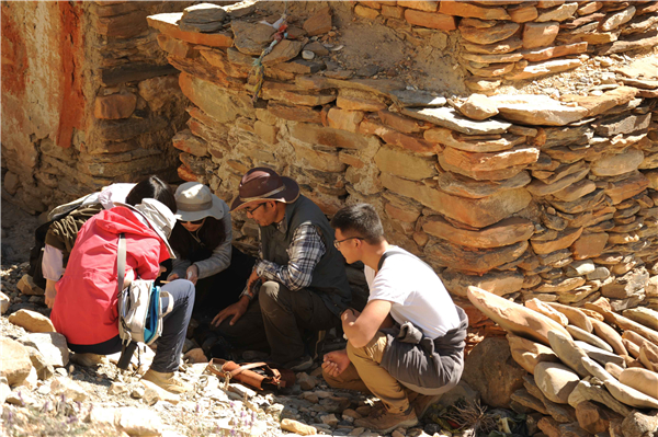 张丽云同学(左一)在西北大学张建林老师(右二)率领下于上木斯塘Chursang村调查佛塔建筑及遗迹遗物