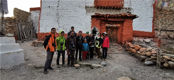 考察团队全体成员在木斯塘Chursang村KunzaCholing Gompa寺庙前合影,左二为何捷老师,右二为张丽云同学