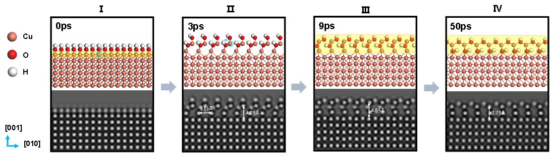 图3. 由ReaxFF反应力场分子动力学模拟预测的双层结构形成机制。分别展示在0 ps(I)、3 ps(II)、9 ps(III)和50 ps(IV)时刻的快照图,上方为原子级表示,下方为高分辨透射电子显微镜(HRTEM)表示。