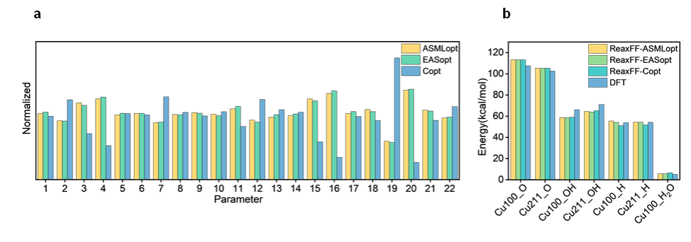 图2. 三种ReaxFF反应力场参数化方法的对比。(a) 通过ASMLopt、EASopt和Copt方法优化得到的ReaxFF反应力场参数。(b) ReaxFF模拟预测的反应能与DFT计算结果的对比。
