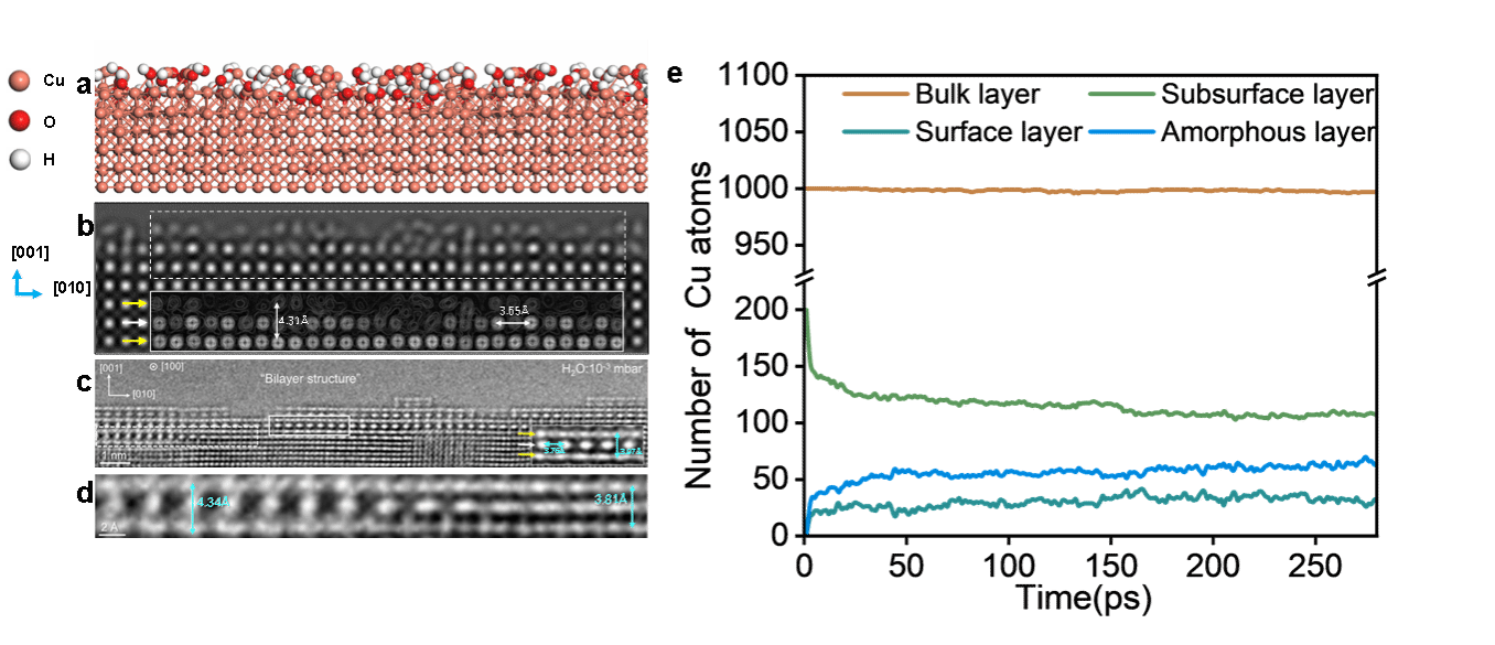 图4. Cu(001)表面与水相互作用的反应机制。(a) ReaxFF反应力场分子动力学模拟中在244ps 时刻的体系快照;(b) 对应的Cu表面高分辨透射电子显微镜(HRTEM)图像;(c) 实验中观察到的双层结构,并在右下角对实线框区域进行放大展示;(d) 对 (c) 中虚线框区域的进一步放大,突出其结构细节;(e) ReaxFF反应力场分子动力学模拟得到的不同层中原子数随时间变化的趋势。
