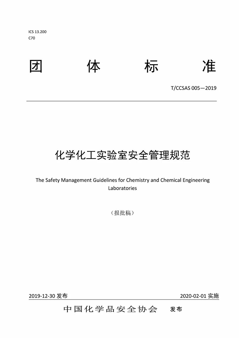 本站讯(通讯员李莎)2019年12月30日,中国化学品安全协会发布公告称,批准发布《化学化工实验室安全管理规范》(T/CCSAS 005-2019)团体标准(以下简称《标准》)。该《标准》将于2020年2月1日开始实施,是国内首个关于化学化工实验室安全管理的团体标准。