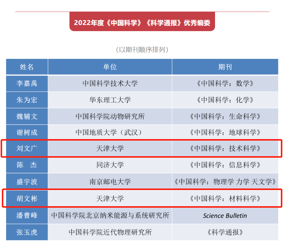 本站讯(通讯员 李珅)在近日召开的《中国科学》和《科学通报》(以下简称两刊)理事会上,公布了“两刊”2022年度10位优秀编委、10位优秀作者和2位优秀编辑的名单。材料学院胡文彬教授、刘文广教授获评优秀编委。