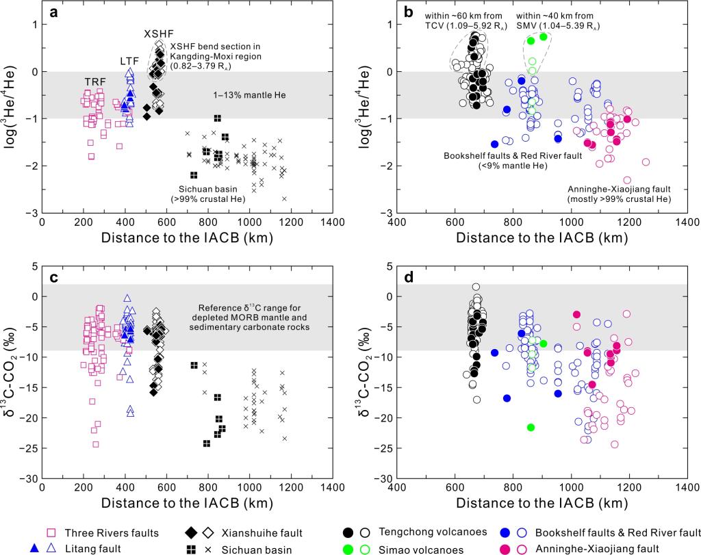 机构的合作者,聚焦青藏高原东南部的主要活动断裂带和第四纪火山区(图1),利用温泉气体的化学成分、He-C-N同位素组成以及定量计算模型,有效区分并厘清了温泉气体中幔源和壳源气体的贡献比例及其空间变化特征,建立了印度-亚洲大陆汇聚背景下深源气体释放与区域应力分布之间的耦合关系。在此基础上,结合区域构造与岩浆活动历史,探讨了中-晚中新世(13–10 Ma)以来青藏高原东南部侧向扩展和局部地表隆升的可能机制。该研究取得了以下主要认识。