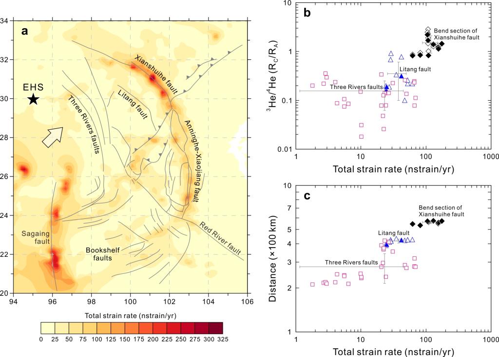 结合温泉气体3He/4He比值分布与区域应变速率场特征,建立了青藏高原东南部深源气体释放与区域应力分布的耦合关系。研究发现,沿印度大陆向亚洲大陆汇聚的方向(即,远离印度-亚洲汇聚边界的NE方向),三江断裂带、理塘断裂和鲜水河断裂的温泉气体3He/4He比值与采样点对应的应变速率表现出显著的正相关关系(图3),表明青藏高原东南部的边界断裂和内部断裂所承载的区域应力存在明显差异。位于高原边界的鲜水河断裂具有较高的剪切应力,有利于断裂深切岩石圈、断裂带渗透性增强以及幔源He的快速释放,即在地表采集的温泉气体中能观察到较高的3He/4He比值。相对来说,位于高原内部的三江断裂带和理塘断裂所承载的区域应力较低,温泉气体的3He/4He比值也相应较低。上述观测结果揭示了印度-亚洲大陆汇聚背景下青藏高原东南部区域应力分布的不均一性。