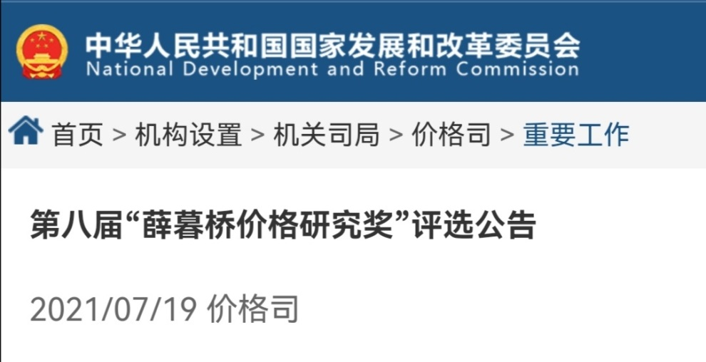 国家发展和改革委员会和中国价格协会网站2021年7月都发布了第八届“薛暮桥价格研究奖”评选公告,成立了第八届“薛暮桥价格研究奖”评选表彰活动组委会。聘任国家发展改革委学术委员会主任、国家发展改革委原常务副主任朱之鑫担任组委会主任,中国社会科学院学部委员张卓元任副主任,国家发展改革委价格司司长万劲松、二级巡视员朱明龙;国家市场监管总局价监竞争局一级巡视员陈志江、反垄断局副局长徐乐夫;国家医保局医药价格和招标采购司司长丁一磊;中国人民大学副校长刘元春;国家发展改革委价格监测中心主任卢延纯;国家发展改革委价格成本调查中心主任黄汉权;国家发展改革委价格认证中心主任吴涧生;国家发展改革委市场与价格研究所所长杨宜勇、原所长臧跃茹;国家发展改革委中国市场出版社社长郭爱东;国家发展改革委学术委员会秘书长刘中显任委员。