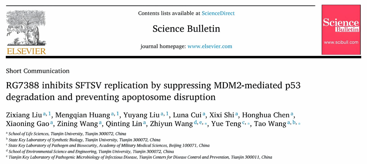 近日,来自天津大学医学部生命科学学院、天津大学合成生物技术全国重点实验室的王涛教授团队在《Science Bulletin》在线发表题为“RG7388 inhibits SFTSV replication by suppressing MDM2-mediated p53 degradation and preventing apoptosome disruption”的研究论文,该工作揭示了SFTSV感染诱发的线粒体损伤与细胞凋亡拮抗之间矛盾的分子机制,并依据研究成果发现抗癌药物RG7388具有良好的抗SFTSV效果。