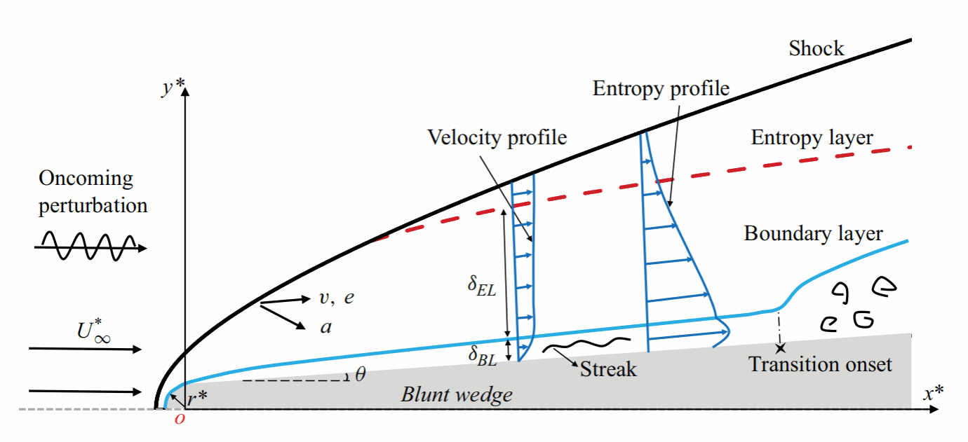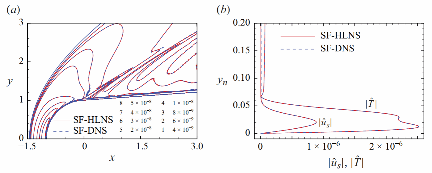 高速边界层转捩往往使飞行器表面的摩擦阻力和热流突增数倍,因此准确预测转捩的位置对于评估飞行器的气动性能至关重要。为降低高超飞行器头部所承受的高热流,常采用钝化前缘设计,这会引发脱体弓形激波和熵层的出现,从而显著抑制边界层中的模态失稳机制及其主导的自然转捩过程,使得非模态扰动主导的旁路(bypass)转捩过程成为触发湍流的主导机制。因而,有效刻画高超边界层中非模态扰动被来流扰动激发的感受性过程尤为关键。近日,天津大学和中科院力学所的研究团队合作,在高超声速钝体边界层的非模态感受性机理及预测方法方面取得突破。该工作以“Excitation of non-modal perturbations in hypersonic boundary layers by free stream forcing: shock-fitting harmonic linearised Navier–Stokes approach”为题,发表在《Journal of Fluid Mechanics》杂志上。