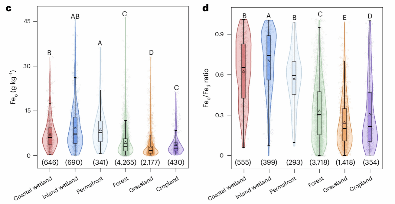 为解答这一问题,天津大学地科院滨海关键带研究团队整合了全球23,000组铁矿物数据,并结合我国32个典型滨海湿地的大尺度野外调查,运用穆斯堡尔谱技术精准解析不同结晶度氧化铁矿物的赋存特征,首次揭示了滨海湿地中亚稳态铁矿物普遍富集的现象,量化了其对有机碳保存的贡献,为预测和调控滨海湿地碳库动态提供了新视角。