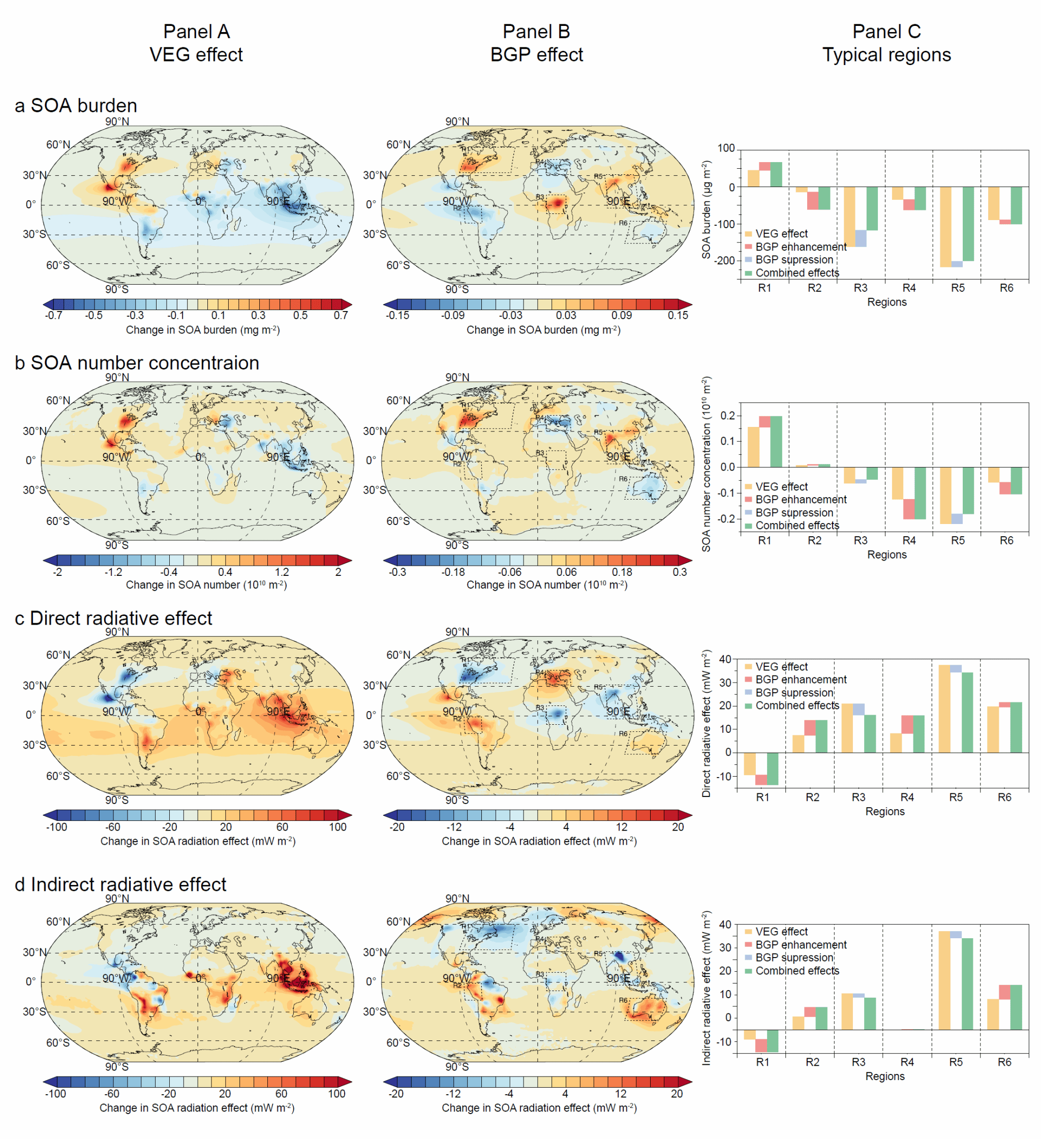 图2 未来植被变化背景下全球和关键区域二次有机气溶胶及其辐射效应预测