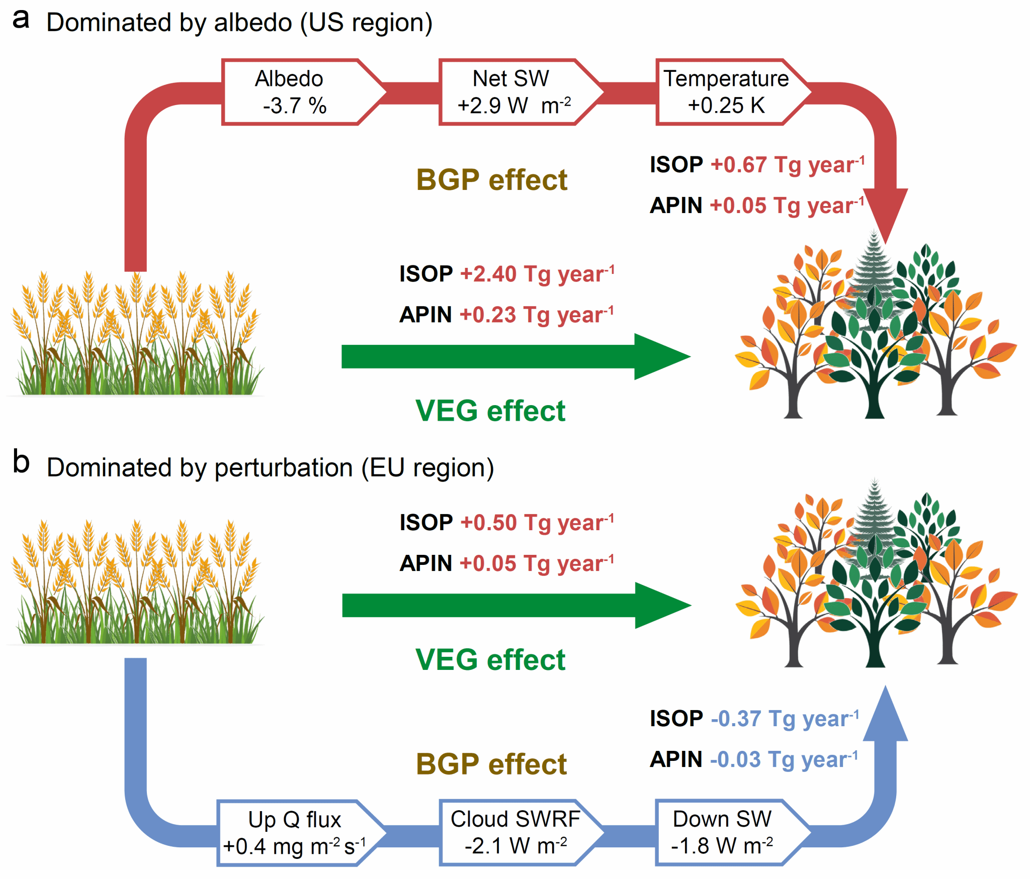 (VEG effect: 植被类型变化的作用,BGP effect:植被生物地球物理效应,ISOP:异戊二烯排放量,APIN: α蒎烯排放量)