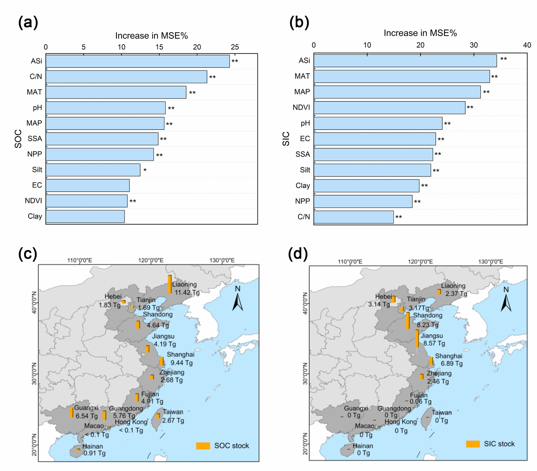 针对上述问题,我院宋照亮教授课题组通过野外采样和相关数据整合,发现我国滨海盐沼的SOC和SIC大小存在较大差异,其分布因植被类型、气候类型和空间位置而异(图1)。通过计算发现,我国滨海盐沼0–100 cm土壤共储存了56.67 Tg SOC和34.88 Tg SIC,表明SIC是盐沼土壤碳的重要组成部分。随机森林分析表明,土壤有效硅是调控SOC和SIC的最重要环境因子(图2)。因此,未来滨海湿地碳管理不仅要增加SOC库,还需要重视SIC库的保护。同时,还应重视硅的调控作用。