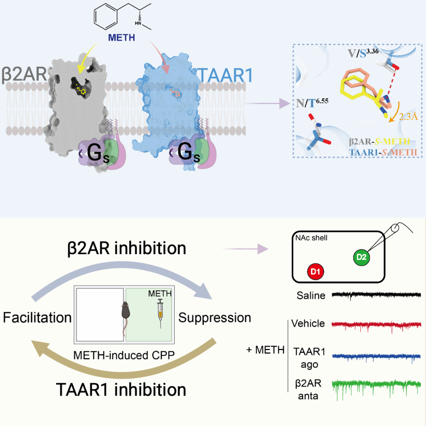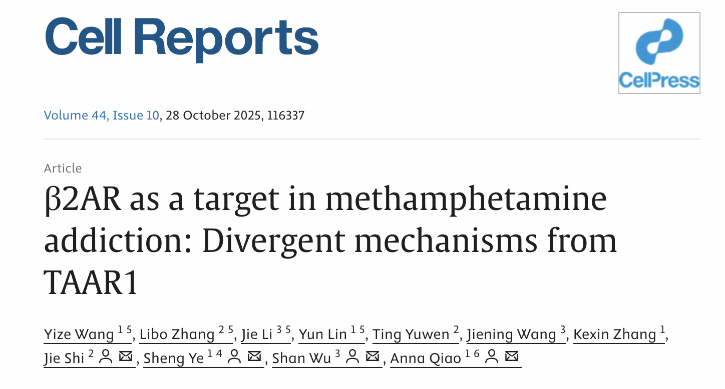 2025年9月24日,天津大学医学部生命科学学院乔安娜、叶升团队联合湖北大学和北京大学合作单位在Cell Repots杂志上发表题为“β2AR as a target in methamphetamine addiction: Divergent mechanisms from TAAR1”的研究文章。该研究首次发现并证实了β2肾上腺素受体(β2AR)是冰毒(甲基苯丙胺,Methamphetamine)的一个直接作用靶点,并系统阐明了其与已知靶点TAAR1在调控冰毒成瘾过程中截然不同的作用机制,为开发针对冰毒等苯丙胺类毒品成瘾的全新疗法提供了重要的理论依据和极具潜力的治疗新靶点。