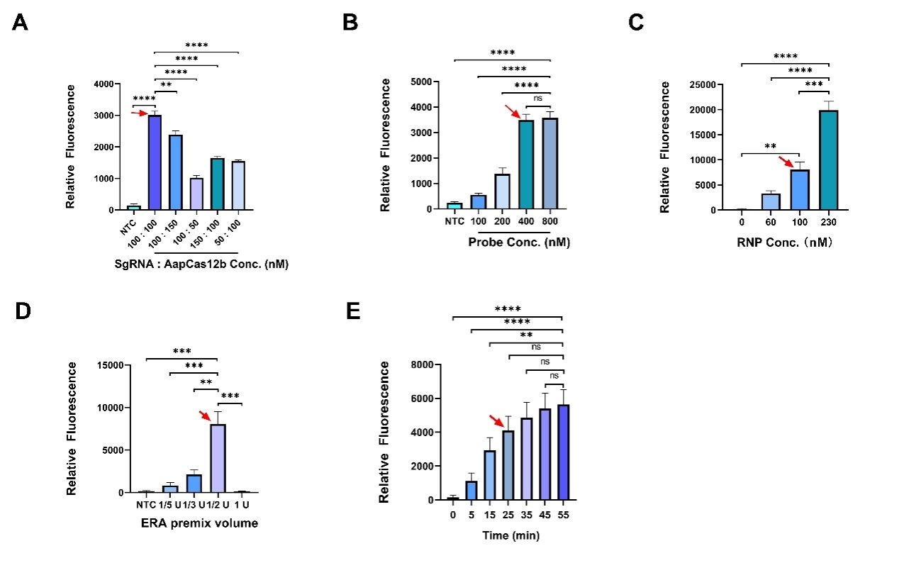 该研究创新性地将等温重组酶扩增技术(ERA)与CRISPR/Cas12b系统整合在同一反应管中,通过温度调控实现扩增与检测的时序分离。具体而言,在37°C阶段进行目标核酸的等温扩增,而在60°C阶段激活Cas12b的切割反应,从而完成信号放大与检测的“一锅法”整合。该设计巧妙地利用了Cas12b在低温下酶活受抑的特性,仅需通过温度切换即可实现系统自动切换,避免了传统两步法中移液导致的污染风险,也无需额外的化学改造或复杂调控。