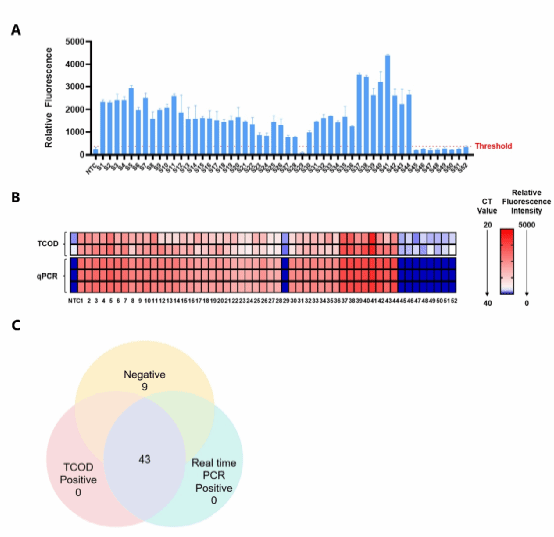 研究人员利用52份临床血清样本对该体系进行了验证,TCOD与实时荧光定量PCR(qPCR)结果的符合率达100%,充分证明了其准确性和可靠性。同时,TCOD体系的检测结果可在蓝光照射下直接通过肉眼观察区分阳性与阴性样本,展现出优异的现场可操作性和直观可视化特征,适合用于基层及应急检测场景。
